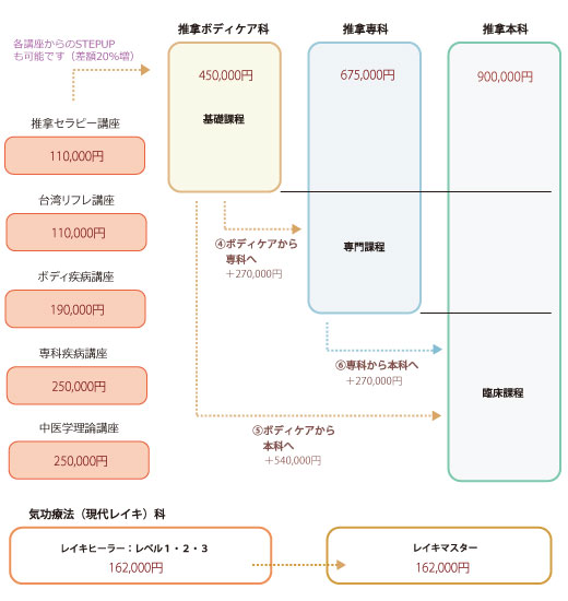 例えば、まずは推拿ボディケア科に入学して、推拿の面白さやスキルアップとして専科・本科に進むことも可能です。